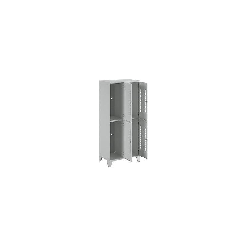 Armadietto in acciaio con piedini, scomparti a metà altezza, ante forate, larghezza scomparti 400 mm, 4 scomparti, grigio chiaro. Fornitura = montato. Altezza = 1850 mm. Profondità = 500 mm. Larghezza = 800 mm. Colore corpo = grigio chiaro RAL 7035. Colore porta = grigio chiaro RAL 7035. Serratura = chiavistello girevole. Numero scomparti in larghezza = 2 pz. Numero scomparti = 4 pz. Larghezza scomparti = 400 mm. Materiale = lamiera d'acciaio. Altezza armadietto = 1850 mm. Dotazione interna = 1 asta appendiabiti, 4 ganci scorrevoli. Larghezza interna = 398 mm. Altezza interna = 820 mm. Profondità interna = 475 mm. Tipo di porta = ante forate. Altezza scomparti = 820 mm. Larghezza ripiani = 400 mm. Profondità ripiani = 500 mm. Altezza piedini = 150 mm. Struttura = saldata a punti. Superficie = con verniciatura a forno. Robusto armadietto con piedini a norma DIN 4547. Spazio ottimizzato grazie agli scomparti a mezza altezza. Disponibili in varie larghezze e colori. A scelta con ante