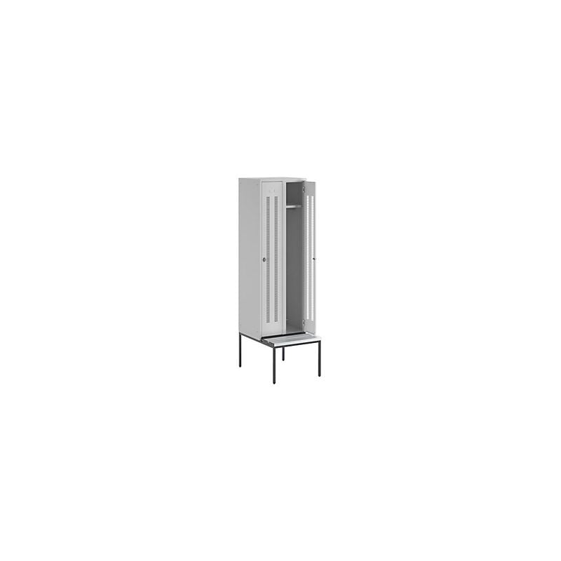 Armadietto guardaroba con panca inferiore integrata, ante in lamiera forata, larghezza scomparti 300 mm, 2 scomparti, grigio chiaro. Fornitura = montato. Altezza = 2140 mm. Larghezza = 600 mm. Profondità = 800 mm. Colore corpo = grigio chiaro RAL 7035. Colore porta = grigio chiaro RAL 7035. Serratura = chiavistello girevole. Numero scomparti in larghezza = 2 pz. Materiale = lamiera d'acciaio saldata. Larghezza scomparti = 300 mm. Profondità scomparti = 500 mm. Dotazione interna = 1 cappelliera, 1 asta appendiabiti con 3 ganci. Altezza sedile = 400 mm. Profondità sedile = 300 mm. Altezza armadio = 1750 mm. Profondità armadio = 500 mm. Tipo di porta = ante forate. Colore doghe = grigio. Colore telaio = nero notte RAL 9005. Serie = BERLIN. Larghezza interna = 298 mm. Altezza interna = 250 / 1420 mm. In robusta lamiera d'acciaio saldata, con rinforzo. Con panca portante. Chiavistello girevole predisposto per lucchetto (diametro staffa 6 - 8 mm max). Doghe in profilati alveolari in WPC di