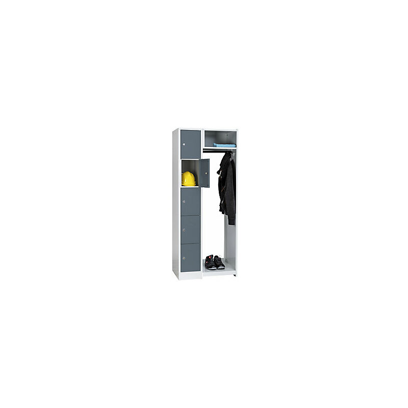 Sistema di strutture guardaroba con armadietti, 5 scomparti a sinistra, 5 grucce, larghezza totale 750 mm, larghezza scomparti 298 mm, grigio basalto / grigio chiaro. Fornitura = in parte smontato. Altezza = 1850 mm. Profondità = 500 mm. Larghezza = 750 mm. Colore corpo = grigio chiaro RAL 7035. Colore porta = grigio basalto. Serratura = serratura a cilindro differenziata. Numero scomparti in larghezza = 1 pz. Numero scomparti = 5 pz. Larghezza scomparti = 300 mm. Materiale = lamiera d'acciaio, con verniciatura a forno. Altezza armadietto = 1850 mm. Dotazione interna = senza dotazione interna. Larghezza interna = 298 mm. Altezza interna = 345 mm. Profondità interna = 475 mm. Tipo di porta = ante piene. Numero chiavi = 2 pz. Altezza scomparti = 350 mm. Larghezza ripiani = 300 mm. Profondità ripiani = 500 mm. Altezza zoccolo = 100 mm. Struttura = saldata. Superficie = con verniciatura a forno. Asta appendiabiti, a sezione ovale, con verniciatura plastica in nero. Portatarghette alt. x