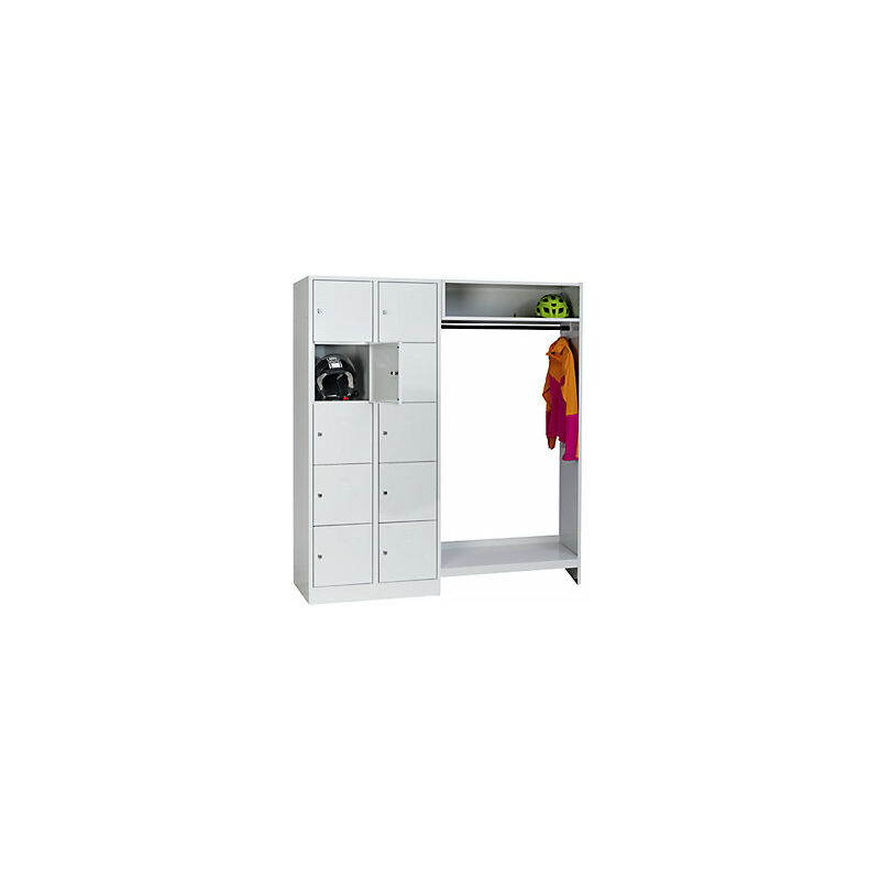 Sistema di strutture guardaroba con armadietti, 10 scomparti a sinistra, 10 grucce, larghezza totale 1670 mm, larghezza scomparti 398 mm, grigio chiaro. Fornitura = in parte smontato. Altezza = 1850 mm. Profondità = 500 mm. Larghezza = 1670 mm. Colore corpo = grigio chiaro RAL 7035. Colore porta = grigio chiaro RAL 7035. Serratura = serratura a cilindro differenziata. Numero scomparti in larghezza = 2 pz. Numero scomparti = 10 pz. Larghezza scomparti = 400 mm. Materiale = lamiera d'acciaio, con verniciatura a forno. Altezza armadietto = 1850 mm. Dotazione interna = senza dotazione interna. Larghezza interna = 398 mm. Altezza interna = 345 mm. Profondità interna = 475 mm. Tipo di porta = ante piene. Numero chiavi = 2 pz. Altezza scomparti = 350 mm. Larghezza ripiani = 400 mm. Profondità ripiani = 500 mm. Altezza zoccolo = 100 mm. Struttura = saldata. Superficie = con verniciatura a forno. Asta appendiabiti, a sezione ovale, con verniciatura plastica in nero. Portatarghette alt. x largh.