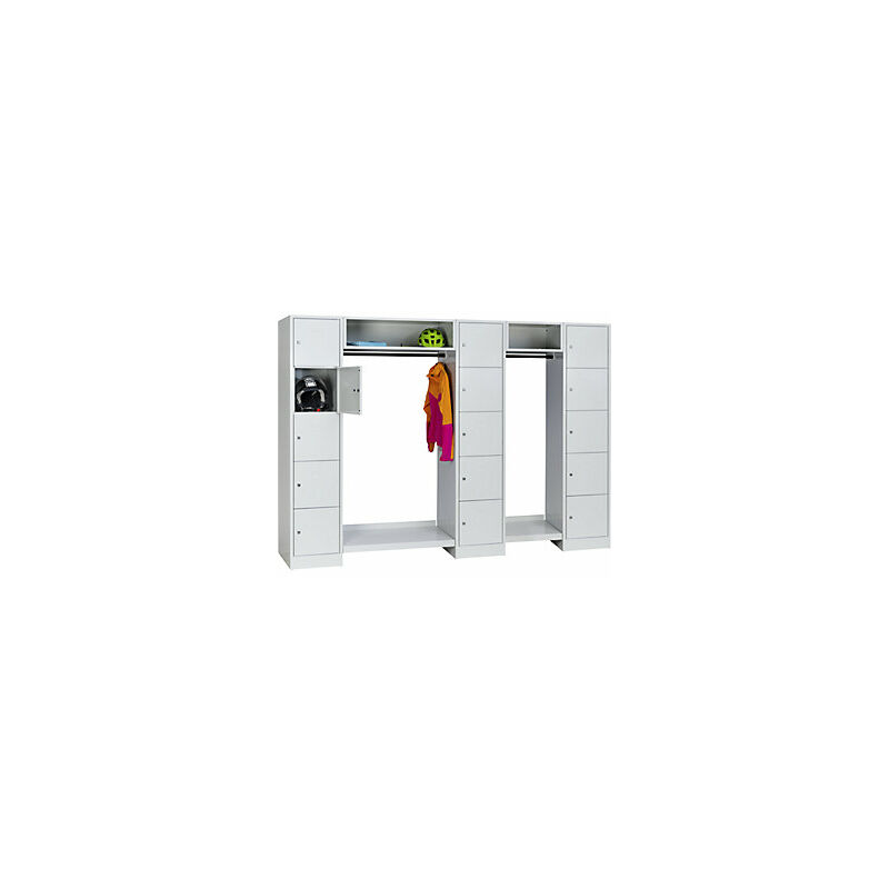 Sistema di strutture guardaroba con armadietti, 15 scomparti esterni/centrali, 15 grucce, larghezza totale 2520 mm, larghezza scomparti 398 mm, grigio chiaro. Fornitura = in parte smontato. Altezza = 1850 mm. Profondità = 500 mm. Larghezza = 2520 mm. Colore corpo = grigio chiaro RAL 7035. Colore porta = grigio chiaro RAL 7035. Serratura = serratura a cilindro differenziata. Numero scomparti in larghezza = 3 pz. Numero scomparti = 15 pz. Larghezza scomparti = 400 mm. Materiale = lamiera d'acciaio, con verniciatura a forno. Altezza armadietto = 1850 mm. Dotazione interna = senza dotazione interna. Larghezza interna = 398 mm. Altezza interna = 345 mm. Profondità interna = 475 mm. Tipo di porta = ante piene. Numero chiavi = 2 pz. Altezza scomparti = 350 mm. Larghezza ripiani = 400 mm. Profondità ripiani = 500 mm. Altezza zoccolo = 100 mm. Struttura = saldata. Superficie = con verniciatura a forno. Asta appendiabiti, a sezione ovale, con verniciatura plastica in nero. Portatarghette alt. x