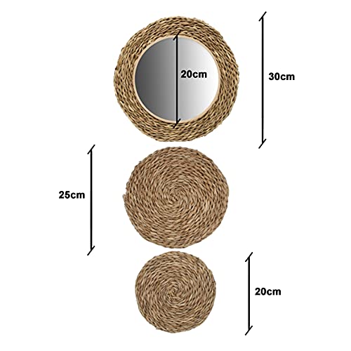8around-Specchio da parete decorazione rattan, composizione 3 elementi di vimini da 30 cm con specchio da parete, 25 cm e 20 cm di diametro e 1 cm di spessore. Decorazione per la casa originale.