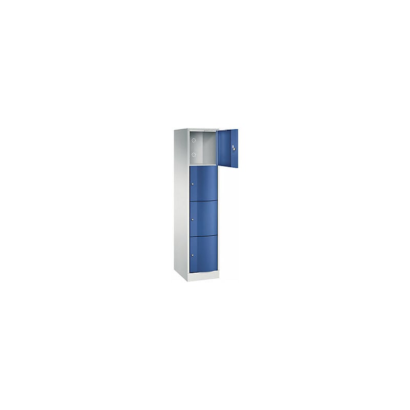 Armadietto a scomparti RESISTO, alt. x largh. x prof. 1950 x 396 x 540 mm, 4 ripiani, grigio chiaro RAL 7035 / blu genziana RAL 5010. Fornitura = montato. Altezza = 1950 mm. Profondità = 540 mm. Larghezza = 396 mm. Colore corpo = grigio chiaro RAL 7035. Colore porta = blu genziana RAL 5010. Serratura = serratura a cilindro differenziata. Numero scomparti in larghezza = 1 pz. Numero scomparti = 4 pz. Larghezza scomparti = 380 mm. Materiale = acciaio. Altezza armadietto = 1950 mm. Dotazione interna = senza dotazione interna. Larghezza interna = 320 mm. Altezza interna = 420 mm. Profondità interna = 460 mm. Tipo di porta = anta a battente. Numero chiavi = 2 pz. Profondità ripiani = 540 mm. Altezza zoccolo = 100 mm. Struttura = saldata. Superficie = con verniciatura a forno. Finecorsa di apertura a 80°. Ante in lamiera d'acciaio di 1,5 mm, arcuate, sicure contro gli atti di vandalismo. Aerazione mediante fori sulla parete posteriore. Robusta struttura d'acciaio con verniciatura a forno di