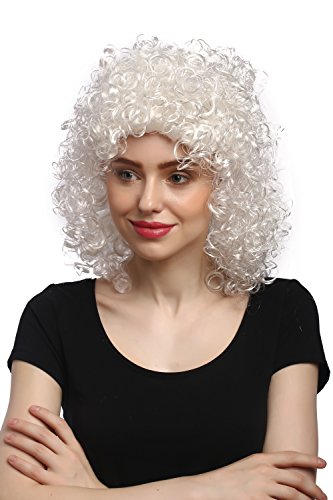 Questa parrucca di lunghezza media, con fitti ricci, di colore bianco appare così insolita da rendere numerose serie di idee di costume, per donne e uomini. Un nobiluomo rinascimentale o barocco viene qui altrettanto rappresentato come un angelo, il bambin Gesù a Natale o una popstar o ballerino degli anni 80. Codice colore: ZA62. Lunghezza: circa 35 cm.