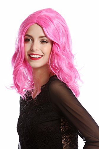 Parrucca da donna per Hallowen e carnevale, da fanciulla disinvolta e carina, di colore rosa. I capelli di mezza lunghezza, che arrivano alle spalle, sono leggermente ondulati e sono separati da una splendida riga in mezzo.