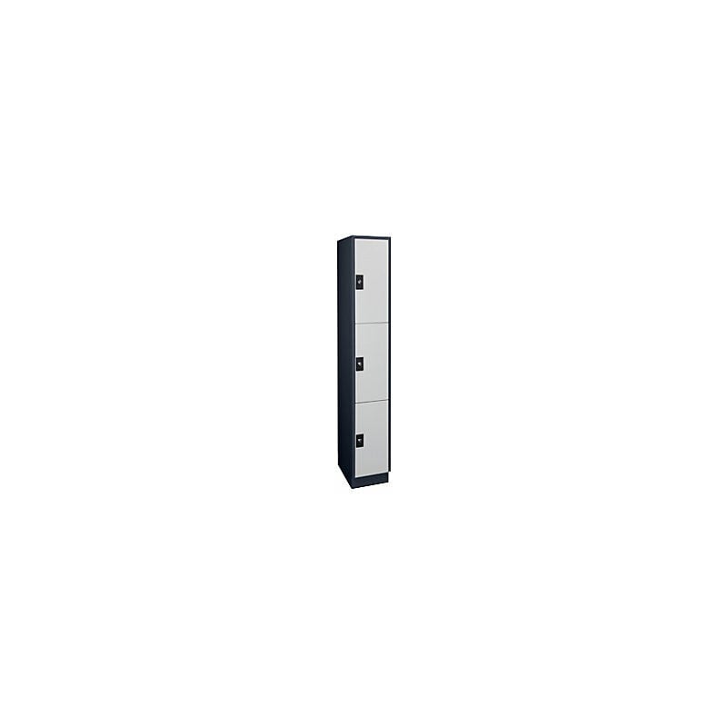 Armadietto a scomparti, 1 vano, 3 scomparti per vano, grigio antracite / grigio chiaro. Fornitura = montato. Altezza = 1800 mm. Profondità = 500 mm. Larghezza = 300 mm. Colore corpo = grigio antracite RAL 7016. Colore porta = grigio chiaro RAL 7035. Serratura = serratura a cilindro di sicurezza differenziata. Numero scomparti in larghezza = 1 pz. Numero scomparti = 3 pz. Larghezza scomparti = 300 mm. Materiale = lamiera d'acciaio. Altezza armadietto = 1800 mm. Dotazione interna = senza dotazione interna. Larghezza interna = 298 mm. Altezza interna = 560 mm. Profondità interna = 475 mm. Tipo di porta = anta a battente. Numero chiavi = 2 pz. Altezza scomparti = 560 mm. Larghezza ripiani = 300 mm. Profondità ripiani = 500 mm. Altezza zoccolo = 100 mm. Struttura = saldata a punti. Superficie = con verniciatura a forno. Facili da pulire grazie agli scomparti interni senza bordi. Aerazione mediante fori sulla parete posteriore. Fermi in gomma per una battuta ante silenziosa. Resistente
