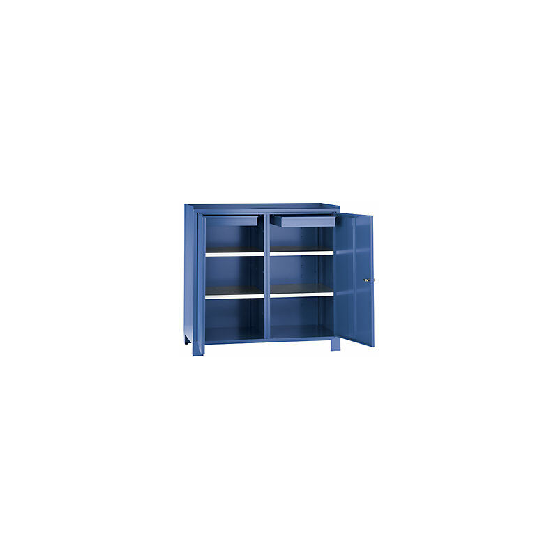 Armadio portattrezzi con piedini, alt. x largh. x prof. 1000 x 1000 x 500 mm, parete divisoria, 1 cassetto e 2 ripiani per lato, blu brillante RAL 5007. Fornitura = montato. Altezza = 1000 mm. Larghezza = 1000 mm. Profondità = 500 mm. Dotazione interna = parete divisoria, 1 cassetto e 2 ripiani per lato. Materiale corpo = lamiera d'acciaio. Superficie = con verniciatura a forno. Colore corpo = blu brillante RAL 5007. Colore porta = blu brillante RAL 5007. Numero ripiani = 4 pz. I piedini facilitano la pulizia sotto gli armadi. Solida struttura in acciaio saldata. Robusta struttura in lamiera d'acciaio con verniciatura a fuoco di elevata qualità in tre colori. Con bordino superiore ribattuto su tre lati. Serratura a cilindro di sicurezza. Cassetti color antracite scorrevoli su guide, estraibili per 2/3.