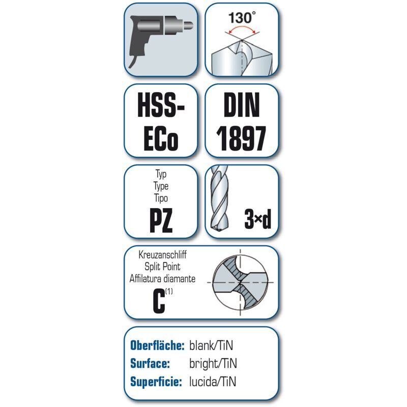 Dettagli tecnici Contenuto 1 pz. Diametro albero 5 mm Diametro di foratura 5 mm Idoneità del materiale Metallo, Acciaio inox, Metalli non ferrosi Lunghezza totale 62 mm Materiale punte HSS-E Proprietà del materiale Cobalto Tipo prodotto Punta a spirale per metallo Punta elicoidale HSS Cobalt, extra corta, DIN 1897 PZ 5% in lega di cobalto con un diametro del nucleo rinforzato a spirale. Particolarmente adatto per materiali resistenti e materiali duri come resistenti agli acidi e inossidabili nichel-cromo legati. Grazie alla struttura corta molto bene per trapani a mano. Testo tradotto automaticamente. Incluso nella consegna null Requisiti di sistema null