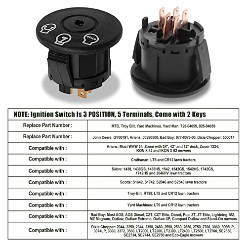Adatto per: per Crafts-man lt2000 interruttore di accensione compatibile con trattori da prato MTD RT99, LT5 e CR12 e trattori da prato Craft-sman LT5 e CR12 e Ari-ens Most WAW 34, Zo-om con 34", 42" e 52" deck, Zoom 52" 34, Io Falciatrici K-ON X 42 e IKON X 52.