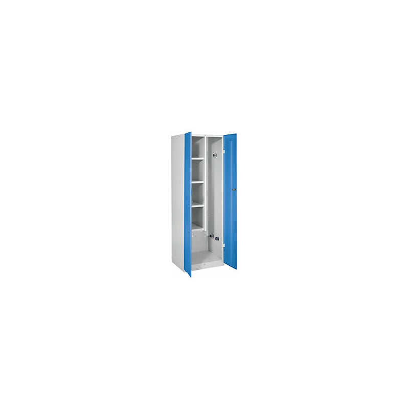 Armadio in acciaio, larghezza 600 mm, 4 ripiani, 1 scomparto portattrezzi, ante blu chiaro. Fornitura = montato. Altezza = 1800 mm. Profondità = 500 mm. Larghezza = 600 mm. Colore corpo = grigio chiaro RAL 7035. Colore porta = blu chiaro RAL 5012. Serratura = serratura a cilindro di sicurezza differenziata. Numero scomparti in larghezza = 1 pz. Numero scomparti = 4 pz. Larghezza scomparti = 600 mm. Materiale = lamiera d'acciaio. Altezza armadietto = 1800 mm. Dotazione interna = 4 ripiani fissi a sinistra, 5 supporti per attrezzi a destra. Larghezza interna = 298 / 298 mm. Altezza interna = 4x320 + 1720 mm. Profondità interna = 475 mm. Tipo di porta = ante piene. Numero chiavi = 2 pz. Altezza scomparti = 320 mm. Larghezza ripiani = 298 mm. Profondità ripiani = 500 mm. Altezza zoccolo = 100 mm. Struttura = saldata a punti. Superficie = con verniciatura a forno. A sinistra con 4 ripiani fissi, a destra con 5 supporti per attrezzi con manico. Robusta struttura in durevole lamiera