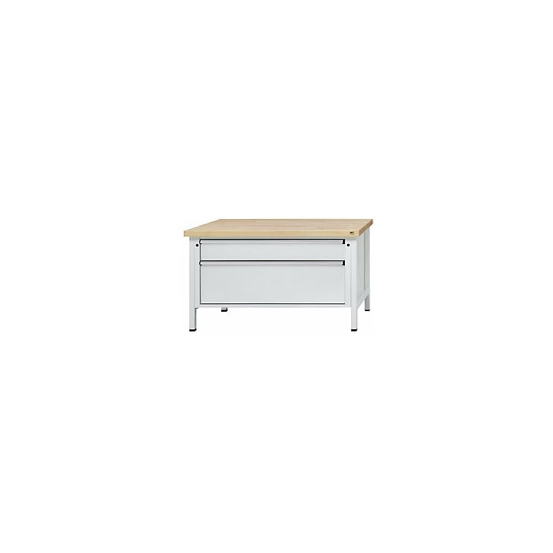 Banco da lavoro con cassetti XL/XXL, struttura modulare, larghezza 1500 mm, 2 cassetti, piano in faggio massello, frontalino in grigio chiaro. Fornitura = montato. Larghezza piano = 1500 mm. Profondità piano = 800 mm. Tipo di piano = piano in faggio massello. Spessore piano = 40 mm. Numero cassetti = 2 pz. Altezza cassetti = 1x180, 1x360 mm. Altezza = 840 mm. Altezza di lavoro = 840 mm. Colore corpo = grigio chiaro RAL 7035. Colore frontalino = grigio chiaro RAL 7035. Portata per cassetto = 100 kg. Estrazione cassetti = 100%. Larghezza cassetti = 1200 mm. Profondità cassetti = 600 mm. Materiale telaio = acciaio, verniciato a polvere. Portata statica = 1500 kg. Versione telaio = tubo a sezione quadra 45x45 mm. Serratura = chiusura centralizzata a cilindro con nucleo sostituibile. 2 in 1: banco da lavoro e cassettiera. Impiegabili nell'industria, reparto produzione, officina ecc. Cassetti particolarmente grandi. Superficie utile fino a 0,72 m² per cassetto. Profondità piano 800 mm