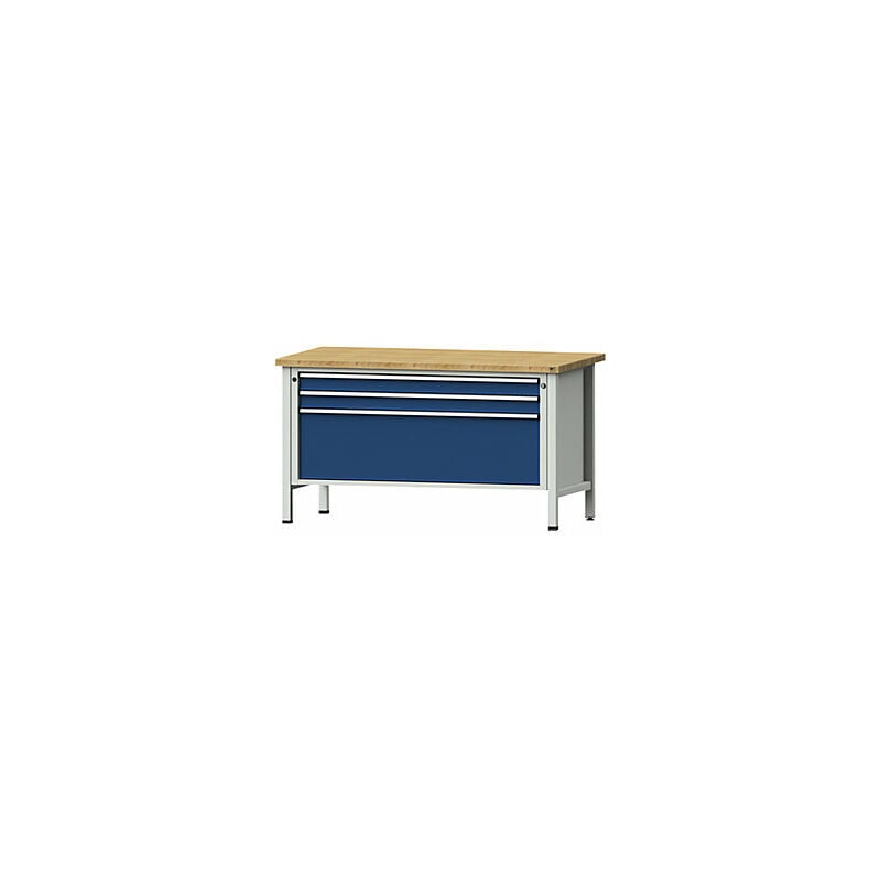 Banco da lavoro con cassetti XL/XXL, struttura modulare, larghezza 1500 mm, 3 cassetti, piano in faggio massello, frontalino in blu genziana. Fornitura = montato. Larghezza piano = 1500 mm. Profondità piano = 800 mm. Tipo di piano = piano in faggio massello. Spessore piano = 40 mm. Numero cassetti = 3 pz. Altezza cassetti = 2x90, 1x360 mm. Altezza = 840 mm. Altezza di lavoro = 840 mm. Colore corpo = grigio chiaro RAL 7035. Colore frontalino = blu genziana RAL 5010. Portata per cassetto = 100 kg. Estrazione cassetti = 100%. Larghezza cassetti = 1200 mm. Profondità cassetti = 600 mm. Materiale telaio = acciaio, verniciato a polvere. Portata statica = 1500 kg. Versione telaio = tubo a sezione quadra 45x45 mm. Serratura = chiusura centralizzata a cilindro con nucleo sostituibile. 2 in 1: banco da lavoro e cassettiera. Impiegabili nell'industria, reparto produzione, officina ecc. Cassetti particolarmente grandi. Superficie utile fino a 0,72 m² per cassetto. Profondità piano 800 mm