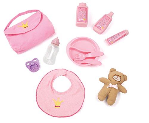 La bambola bebè è dotata di tanti accessori come l'orsetto, il piatto con le posate, il biberon, il ciuccio, il bavaglino, la borsa e i biberon.