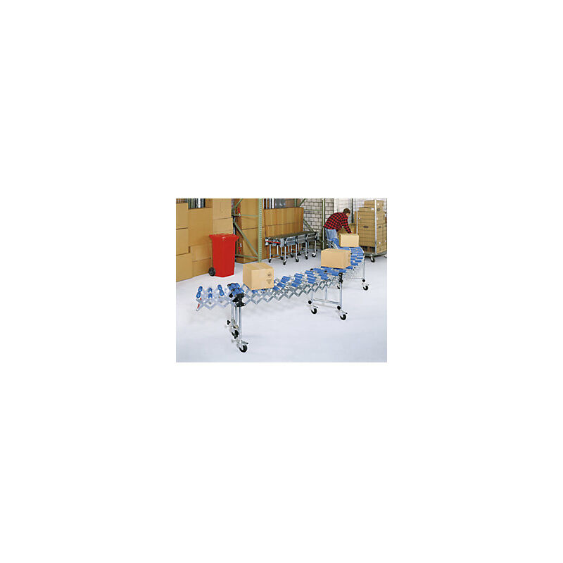 Trasportatore a rulli a pantografo, lunghezza trasportatore 2600 - 9800 mm (estraibile), larghezza trasportatore 400 mm. Fornitura = montato. Numero elementi d'appoggio = 6 pz. Larghezza trasportatore = 400 mm. Lunghezza trasportatore = 2600 - 9800 mm. Larghezza carico = 250 - 600 mm. Portata a distanza base d'appoggio = 125 kg. Materiale rotelle = plastica. Rotelle per asse = 2 pz. Versione rulli = plastica. Tipo di prodotto = trasportatori a pantografo. Ottimizzano il flusso del materiale e sono adatti all'impiego mobile. Pieghevoli per un ingombro ridotto. Versione di lunga durata zincata a specchio. I trasportatori a rulli a pantografo GURA rispondono a tutte le esigenze di trasporto di merci in un'azienda. Questa versione è particolarmente pratica per chi non cerca un sistema fisso. Strutture logistiche proprie possono essere modificate in modo ottimale e ampliate secondo le necessità. I trasportatori sono regolabili in lunghezza e in altezza e permettono di formare curve fino a
