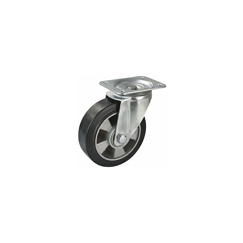Ruota in gomma piena elastica, nera, Ø x larghezza ruota 200 x 50 mm, rotella pivottante. Fornitura = montato. Diametro ruote = 200 mm. Forma = rotella pivottante. Materiale ruote = gomma - gomma piena - completamente elastico. Materiale cerchioni = alluminio. Materiale corpo = acciaio. Portata a 4 km/h = 400 kg. Tipo di fissaggio = con piastra di fissaggio. Larghezza ruote = 50 mm. Altezza d'ingombro = 235 mm. Cuscinetti ruota = cuscinetto a sfera di precisione. Resistenza alle temperature = da -20 °C fino a +70 °C. Sporgenza rotelle pivottanti = 54 mm. Diametro fori filettati = 11 mm. Lunghezza mozzo = 60 mm. Foro mozzo = 20 mm. Versione cerchioni = cerchione a stella. Dimensioni piastra rotella a supporto fisso mm = 135x110 mm. Dimensioni piastra rotella pivottante = 135x110 mm. Interasse fori filettati = 105x80 mm. Superficie del corpo = zincatura. Su cerchione in alluminio. Ridotta resistenza al rotolamento, scorrimento silenzioso. Comfort elevato, grande elasticità. Durezza 70