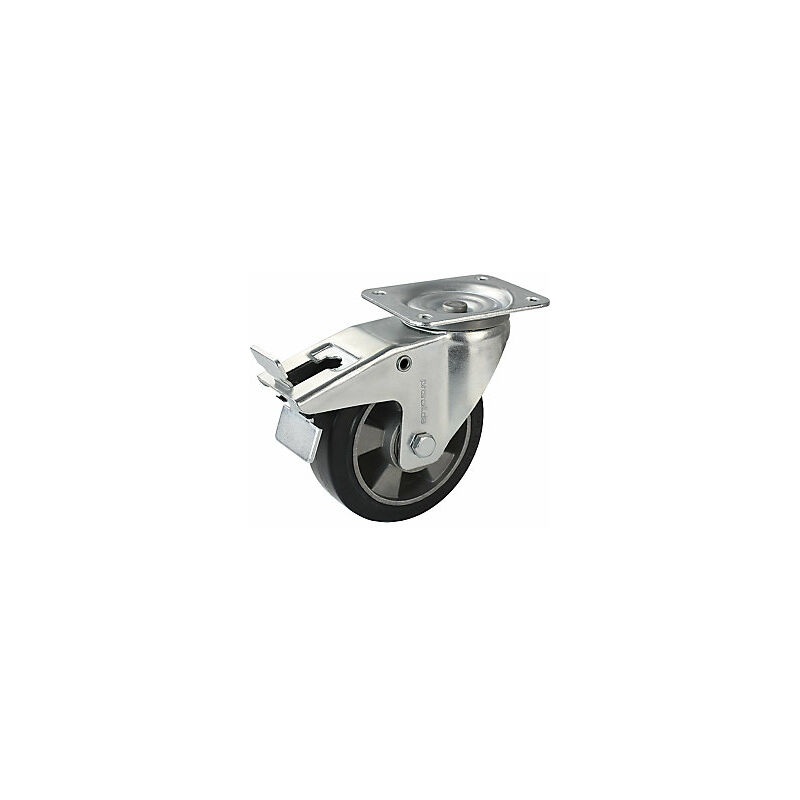 Ruota in gomma piena elastica, nera, Ø x larghezza ruota 200 x 50 mm, rotella pivottante con fermo doppio. Fornitura = montato. Diametro ruote = 200 mm. Forma = rotella pivottante con fermo doppio. Materiale ruote = gomma - gomma piena - completamente elastico. Materiale cerchioni = alluminio. Materiale corpo = acciaio. Portata a 4 km/h = 400 kg. Tipo di fissaggio = con piastra di fissaggio. Larghezza ruote = 50 mm. Altezza d'ingombro = 235 mm. Cuscinetti ruota = cuscinetto a sfera di precisione. Resistenza alle temperature = da -20 °C fino a +70 °C. Sporgenza rotelle pivottanti = 54 mm. Diametro fori filettati = 11 mm. Lunghezza mozzo = 60 mm. Foro mozzo = 20 mm. Versione cerchioni = cerchione a stella. Dimensioni piastra rotella a supporto fisso mm = 135x110 mm. Dimensioni piastra rotella pivottante = 135x110 mm. Interasse fori filettati = 105x80 mm. Superficie del corpo = zincatura. Su cerchione in alluminio. Ridotta resistenza al rotolamento, scorrimento silenzioso. Comfort