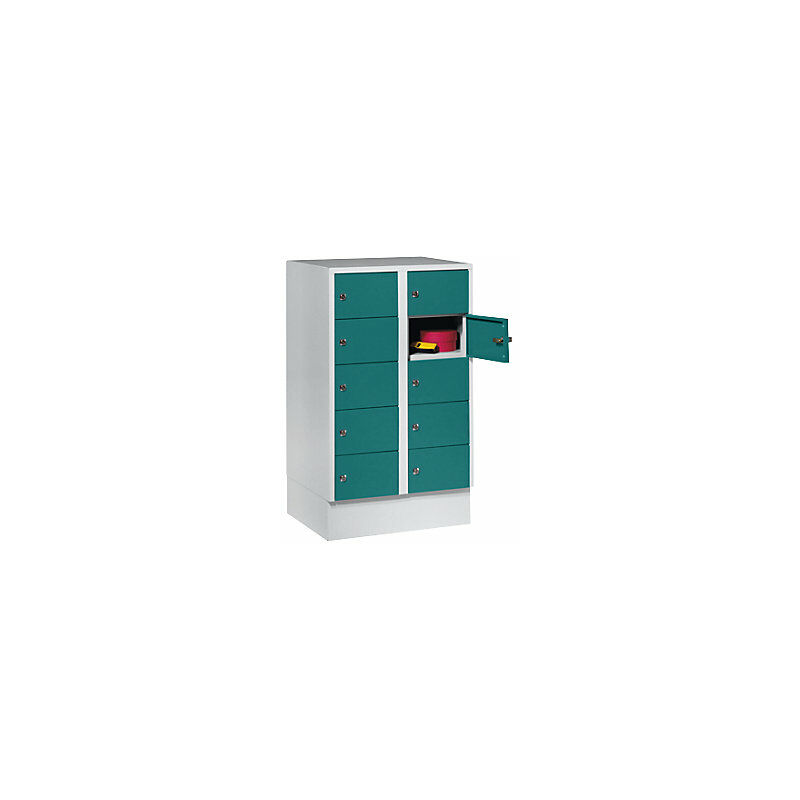 Armadio a piccoli scomparti, 10 scomparti, alt. x largh. 990 x 600 mm, colore ante verde opale RAL 6026. Fornitura = montato. Altezza = 990 mm. Profondità = 500 mm. Larghezza = 600 mm. Colore corpo = grigio chiaro RAL 7035. Colore porta = verde opale RAL 6026. Serratura = serratura a cilindro differenziata. Numero scomparti in larghezza = 2 pz. Numero scomparti = 10 pz. Larghezza scomparti = 300 mm. Materiale = lamiera d'acciaio, saldata a punti. Altezza armadietto = 990 mm. Dotazione interna = senza dotazione interna. Larghezza interna = 298 mm. Altezza interna = 175 mm. Profondità interna = 475 mm. Tipo di porta = anta a battente. Numero chiavi = 2 pz. Altezza scomparti = 175 mm. Larghezza ripiani = 300 mm. Profondità ripiani = 500 mm. Altezza zoccolo = 100 mm. Struttura = saldata a punti. Superficie = con verniciatura a forno. Aerazione mediante fori sulla parete posteriore. Scomparti senza dotazione interna. Struttura scatolata doppia. Struttura in lamiera d'acciaio con saldatura a