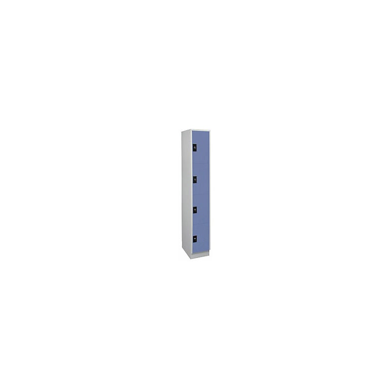 Armadietto a scomparti, 1 vano, 4 scomparti per vano, grigio chiaro / blu colomba. Fornitura = montato. Altezza = 1800 mm. Profondità = 500 mm. Larghezza = 300 mm. Colore corpo = grigio chiaro RAL 7035. Colore porta = blu colomba RAL 5014. Serratura = serratura a cilindro di sicurezza differenziata. Numero scomparti in larghezza = 1 pz. Numero scomparti = 4 pz. Larghezza scomparti = 300 mm. Materiale = lamiera d'acciaio. Altezza armadietto = 1800 mm. Dotazione interna = senza dotazione interna. Larghezza interna = 298 mm. Altezza interna = 420 mm. Profondità interna = 475 mm. Tipo di porta = anta a battente. Numero chiavi = 2 pz. Altezza scomparti = 420 mm. Larghezza ripiani = 300 mm. Profondità ripiani = 500 mm. Altezza zoccolo = 100 mm. Struttura = saldata a punti. Superficie = con verniciatura a forno. Facili da pulire grazie agli scomparti interni senza bordi. Aerazione mediante fori sulla parete posteriore. Fermi in gomma per una battuta ante silenziosa. Resistente struttura in
