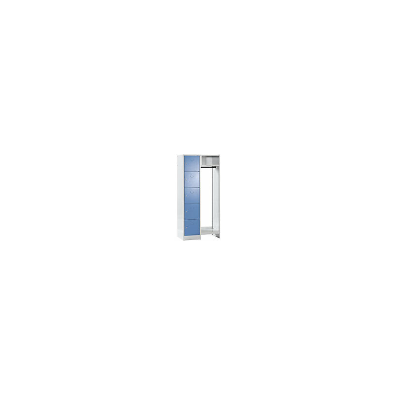 Sistema di strutture guardaroba con armadietti, 5 scomparti a sinistra, 5 grucce, larghezza totale 850 mm, larghezza scomparti 398 mm, blu chiaro / grigio chiaro. Fornitura = in parte smontato. Altezza = 1850 mm. Profondità = 500 mm. Larghezza = 850 mm. Colore corpo = grigio chiaro RAL 7035. Colore porta = blu chiaro RAL 5012. Serratura = serratura a cilindro differenziata. Numero scomparti in larghezza = 1 pz. Numero scomparti = 5 pz. Larghezza scomparti = 400 mm. Materiale = lamiera d'acciaio, con verniciatura a forno. Altezza armadietto = 1850 mm. Dotazione interna = senza dotazione interna. Larghezza interna = 398 mm. Altezza interna = 345 mm. Profondità interna = 475 mm. Tipo di porta = ante piene. Numero chiavi = 2 pz. Altezza scomparti = 350 mm. Larghezza ripiani = 400 mm. Profondità ripiani = 500 mm. Altezza zoccolo = 100 mm. Struttura = saldata. Superficie = con verniciatura a forno. Asta appendiabiti, a sezione ovale, con verniciatura plastica in nero. Portatarghette alt. x