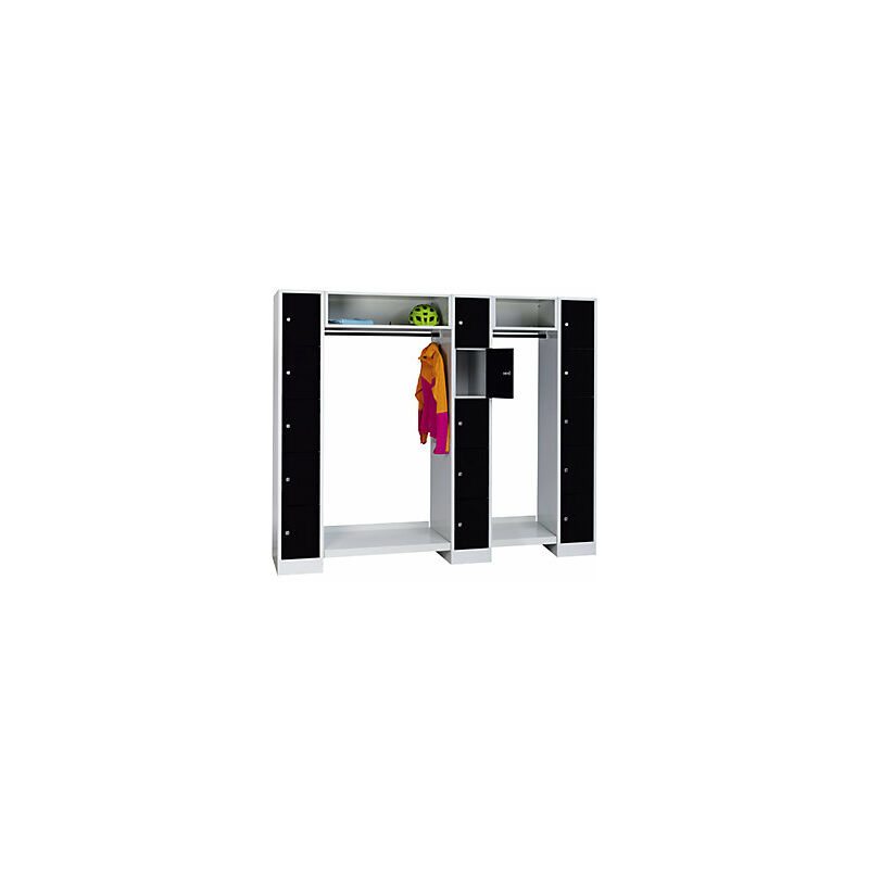 Sistema di strutture guardaroba con armadietti, 15 scomparti esterni/centrali, 15 grucce, larghezza totale 2220 mm, larghezza scomparti 298 mm, nero notte/grigio chiaro. Fornitura = in parte smontato. Altezza = 1850 mm. Profondità = 500 mm. Larghezza = 2220 mm. Colore corpo = grigio chiaro RAL 7035. Colore porta = nero notte RAL 9005. Serratura = serratura a cilindro differenziata. Numero scomparti in larghezza = 3 pz. Numero scomparti = 15 pz. Larghezza scomparti = 300 mm. Materiale = lamiera d'acciaio, con verniciatura a forno. Altezza armadietto = 1850 mm. Dotazione interna = senza dotazione interna. Larghezza interna = 298 mm. Altezza interna = 345 mm. Profondità interna = 475 mm. Tipo di porta = ante piene. Numero chiavi = 2 pz. Altezza scomparti = 350 mm. Larghezza ripiani = 300 mm. Profondità ripiani = 500 mm. Altezza zoccolo = 100 mm. Struttura = saldata. Superficie = con verniciatura a forno. Asta appendiabiti, a sezione ovale, con verniciatura plastica in nero. Portatarghette