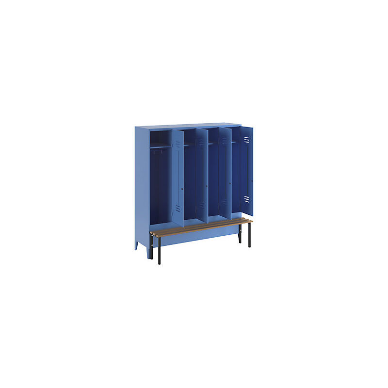 Armadietto guardaroba con panca anteriore, ante piene, larghezza scomparti 400 mm, 4 scomparti, blu chiaro. Fornitura = montato. Altezza = 1850 mm. Larghezza = 1600 mm. Profondità = 805 mm. Colore corpo = blu chiaro RAL 5012. Colore porta = blu chiaro RAL 5012. Serratura = chiavistello girevole. Numero scomparti in larghezza = 4 pz. Materiale = lamiera d'acciaio. Larghezza scomparti = 400 mm. Profondità scomparti = 500 mm. Dotazione interna = 1 cappelliera, 1 asta appendiabiti con 4 ganci. Altezza sedile = 415 mm. Profondità sedile = 300 mm. Altezza piedini = 150 mm. Altezza armadio = 1850 mm. Profondità armadio = 500 mm. Tipo di porta = ante piene. Colore doghe = faggio. Colore telaio = nero notte RAL 9005. Serie = BERLIN. Larghezza interna = 398 mm. Altezza interna = 250 / 1420 mm. In robusta lamiera d'acciaio saldata, con rinforzo. Con panca anteriore e ante ridotte. Chiavistello girevole predisposto per lucchetto (diametro staffa 6 - 8 mm max). Portatarghette, alt. x largh. 35 x 68