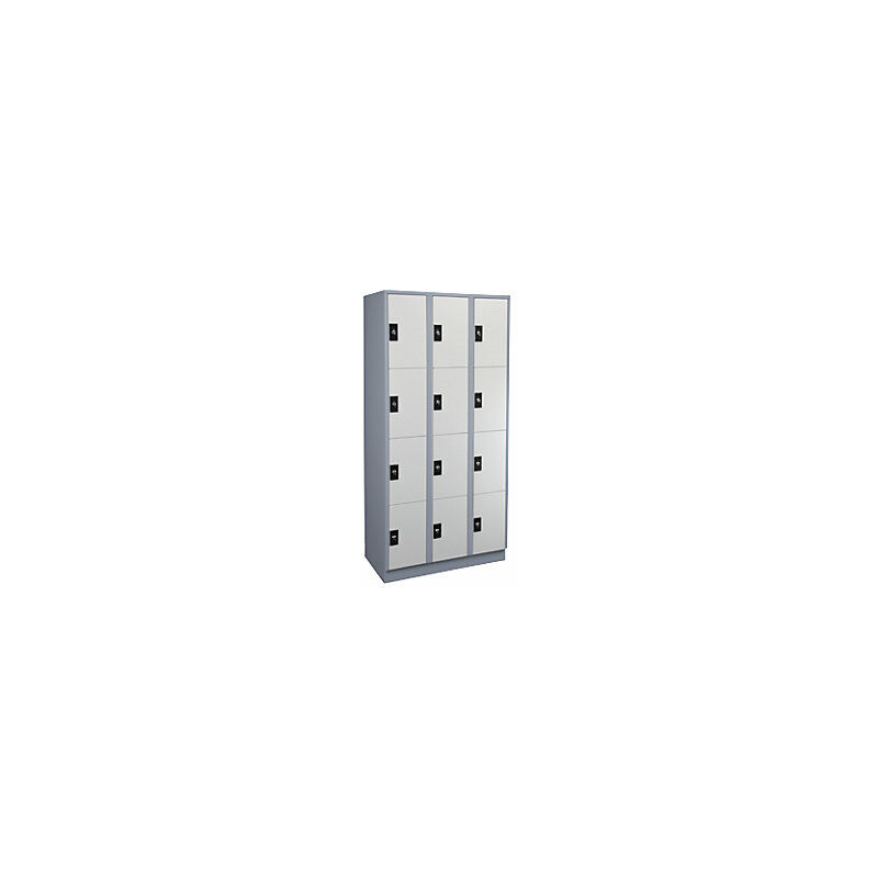 Armadietto a scomparti, 3 vani, 4 scomparti per vano, grigio argento / grigio chiaro. Fornitura = montato. Altezza = 1800 mm. Profondità = 500 mm. Larghezza = 900 mm. Colore corpo = grigio argento RAL 7001. Colore porta = grigio chiaro RAL 7035. Serratura = serratura a cilindro di sicurezza differenziata. Numero scomparti in larghezza = 3 pz. Numero scomparti = 12 pz. Larghezza scomparti = 300 mm. Materiale = lamiera d'acciaio. Altezza armadietto = 1800 mm. Dotazione interna = senza dotazione interna. Larghezza interna = 298 mm. Altezza interna = 420 mm. Profondità interna = 475 mm. Tipo di porta = anta a battente. Numero chiavi = 2 pz. Altezza scomparti = 420 mm. Larghezza ripiani = 300 mm. Profondità ripiani = 500 mm. Altezza zoccolo = 100 mm. Struttura = saldata a punti. Superficie = con verniciatura a forno. Facili da pulire grazie agli scomparti interni senza bordi. Aerazione mediante fori sulla parete posteriore. Fermi in gomma per una battuta ante silenziosa. Resistente
