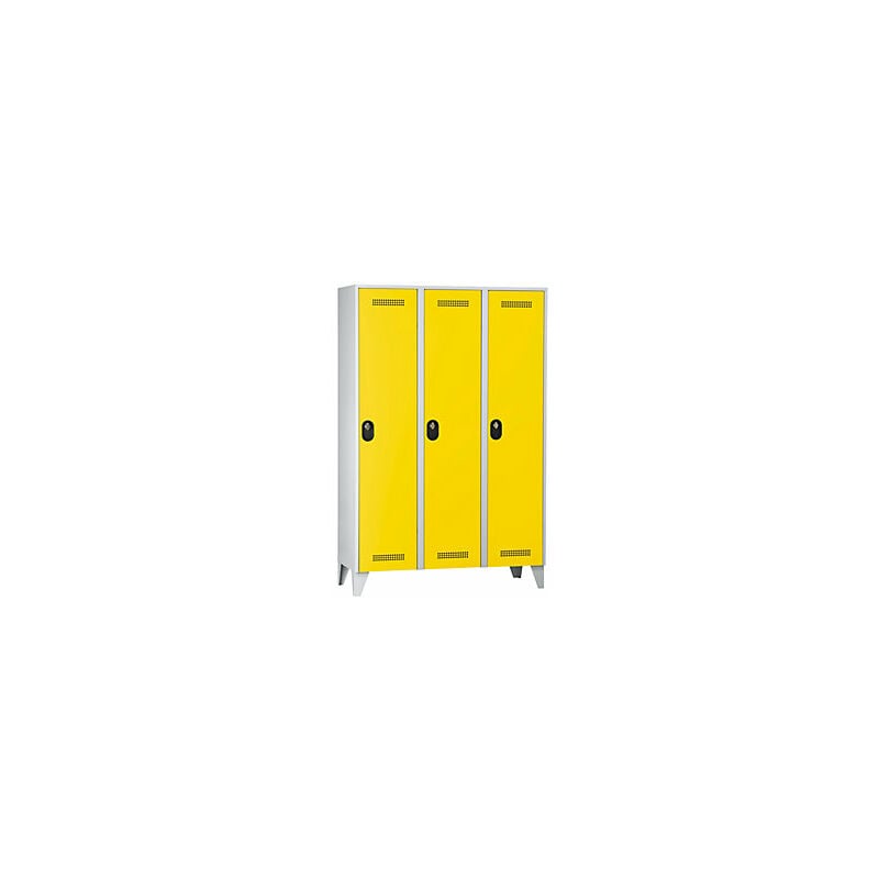 Armadio guardaroba, altezza scaffale 1700 mm, alt. x largh. x prof. 1850 x 1200 x 500 mm, larghezza scomparto 400 mm, colore corpo / ante: grigio chiaro / giallo zinco. Fornitura = montato. Altezza = 1850 mm. Profondità = 500 mm. Larghezza = 1200 mm. Colore corpo = grigio chiaro RAL 7035. Colore porta = giallo zinco RAL 1018. Serratura = chiavistello girevole di sicurezza per lucchetto. Numero scomparti in larghezza = 3 pz. Larghezza scomparti = 400 mm. Materiale = lamiera d'acciaio, saldata a punti. Altezza armadietto = 1700 mm. Dotazione interna = 1 ripiano per cappelli, 1 asta appendiabiti, 3 ganci. Larghezza interna = 398 mm. Altezza interna = 250/1400 mm. Profondità interna = 475 mm. Tipo di porta = anta a battente. Altezza piedini = 150 mm. Struttura = saldata a punti. Superficie = con verniciatura a forno. Robusta struttura in lamiera d'acciaio saldata a punti, completa di bordi con doppia profilatura contro il pericolo di lesioni. Ante dotate di rinforzo interno, incernierate