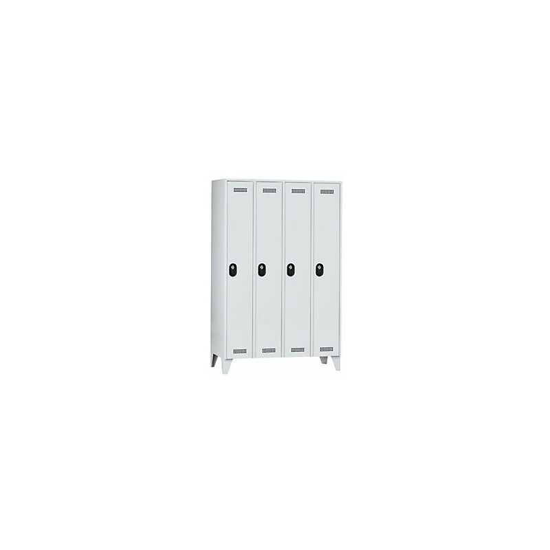 Armadio guardaroba, altezza scaffale 1700 mm, alt. x largh. x prof. 1850 x 1200 x 500 mm, larghezza scomparto 300 mm, colore corpo / ante: grigio chiaro / grigio chiaro. Fornitura = montato. Altezza = 1850 mm. Profondità = 500 mm. Larghezza = 1200 mm. Colore corpo = grigio chiaro RAL 7035. Colore porta = grigio chiaro RAL 7035. Serratura = chiavistello girevole di sicurezza per lucchetto. Numero scomparti in larghezza = 4 pz. Larghezza scomparti = 300 mm. Materiale = lamiera d'acciaio, saldata a punti. Altezza armadietto = 1700 mm. Dotazione interna = 1 ripiano per cappelli, 1 asta appendiabiti, 3 ganci. Larghezza interna = 298 mm. Altezza interna = 250/1400 mm. Profondità interna = 475 mm. Tipo di porta = anta a battente. Altezza piedini = 150 mm. Struttura = saldata a punti. Superficie = con verniciatura a forno. Robusta struttura in lamiera d'acciaio saldata a punti, completa di bordi con doppia profilatura contro il pericolo di lesioni. Ante dotate di rinforzo interno, incernierate