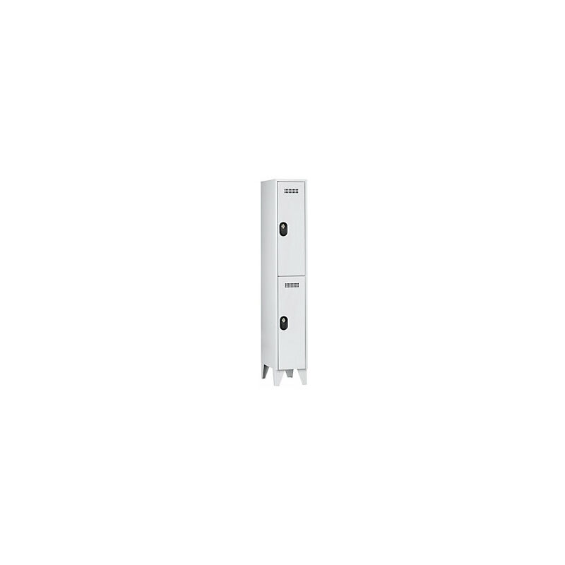 Armadio guardaroba, altezza scaffale 820 mm, alt. x largh. x prof. 1850 x 300 x 500 mm, larghezza scomparto 300 mm, colore corpo / ante: grigio chiaro / grigio chiaro. Fornitura = montato. Altezza = 1850 mm. Profondità = 500 mm. Larghezza = 300 mm. Colore corpo = grigio chiaro RAL 7035. Colore porta = grigio chiaro RAL 7035. Serratura = chiavistello girevole di sicurezza per lucchetto. Numero scomparti = 2 pz. Larghezza scomparti = 300 mm. Materiale = lamiera d'acciaio, saldata a punti. Altezza armadietto = 1850 mm. Dotazione interna = 1 asta appendiabiti, 3 ganci. Larghezza interna = 298 mm. Altezza interna = 820 mm. Profondità interna = 475 mm. Tipo di porta = anta a battente. Altezza scomparti = 850 mm. Larghezza ripiani = 300 mm. Profondità ripiani = 500 mm. Altezza piedini = 150 mm. Struttura = saldata a punti. Superficie = con verniciatura a forno. Robusta struttura in lamiera d'acciaio saldata a punti, completa di bordi con doppia profilatura contro il pericolo di lesioni. Ante