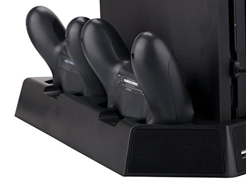 Il supporto di due ventole di raffreddamento migliora le prestazioni della tua console. La base di ricarica incorporata include 2 caricabatterie per controller Dualshock 4, 3 HUB USB 3.0 inclusi nel supporto, consentendo la ricarica di più dispositivi contemporaneamente;
