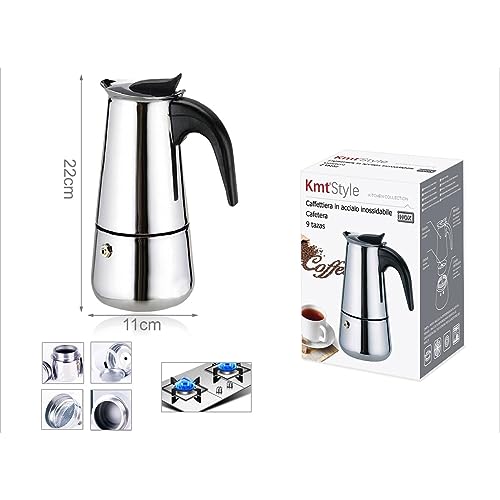 A2ZWORLD Caffettiera Acciaio Inox, Colore Argento, Manico Anti Scottatura, Compatibile con Fornello Elettrico e a Gas, NON Induzione (9 Tazze 22X11cm)