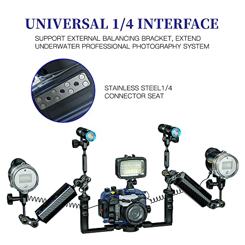 ♦La faccia superiore è in acciaio inox, può essere montata ad un accessorio subacqueo. Il manico (filettatura ¼”), la parte frontale della custodia ha una filettatura di 67mm ed è compatibile con tutti gli accessori da 67mm, come ad esempio filtri, macro lenti, lenti di correzione angolare ecc.