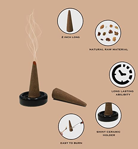 Linee guida per l'uso: posizionare il cono di incenso sul bruciatore di incenso in ceramica fornito nella scatola. Accendi la punta per 3-5 secondi. Spegnere delicatamente la fiamma e attendere qualche secondo che il cono rilasci la sua incantevole fragranza.