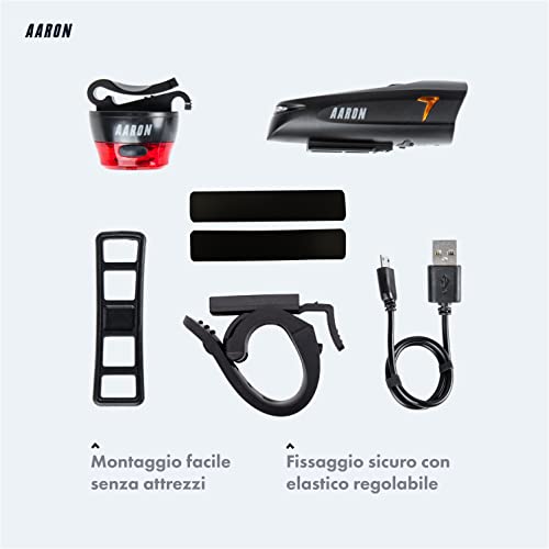 AARON Lux - Set di luci per Bicicletta al LED - Frontale e Posteriore - Ricaricabili con USB e Impermeabili IPX5/4 - per Bici da Corsa, elettrica, Mountain Bike, da Trekking e Turismo