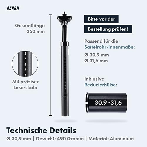 ✅ Ambiente pulito: i prodotti AARON si distinguono per la loro lunga durata. Il reggisella AARON Spring di alta qualità diventa così un compagno fedele e a lungo termine. Inoltre, il reggisella viene fornito anche senza plastica in una scatola di cartone per proteggere l'ambiente.