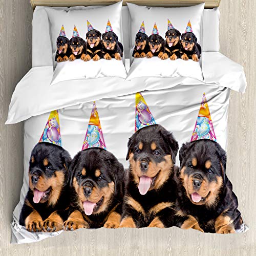 ABAKUHAUS Compleanno Set Copripiumino, Compleanno Cani Cappelli, Arredamento del Letto, 3 Pezzi con 2 Federe Cuscini, 155 x 200 cm - 80 x 80 cm, Calendula e Nero