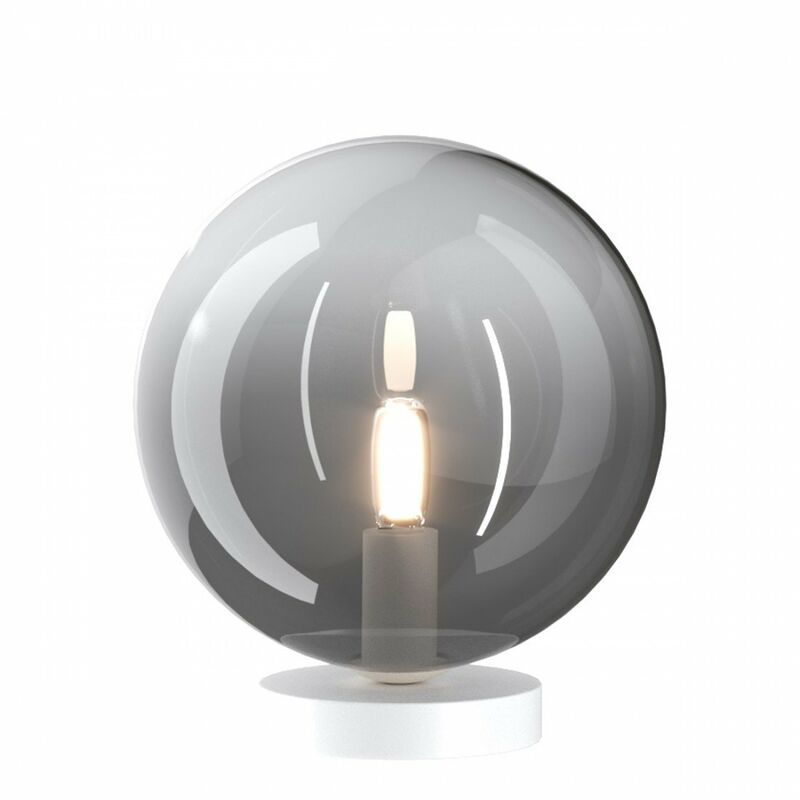 Abat jour in vetro pirex soffiato molto raffinata, semplice da posizionare come lampada da comodino o per illuminare qualsiasi piano d'appoggio, una luce diffusa per una piacevole atmosfera accogliente. Abat-jour moderna Top Light ECLIPSE 1184 BI P FU G9 LED Lampada da tavolo in vetro fumè e base bianca, da interni Categoria: Abat jour ECLIPSE è una lampada da tavolo composta da una sfera in vetro pirex soffiato FUME'. La finitura dei vetri si presenta omogenea nelle versioni trasparente e bianco fog. oppure sfumata verso il basso nelle versioni ambra, rame, oro o fumè (come immagine corrispondente). La struttura in metallo è bianca a richiesta cromo o ottone satinato L'abat-jour è provvista di un portalampade attacco G9 per una lampadina a led da 8w esclusa. Misura un diametro base di 15 centimetri ed un'altezza di 18 centimetri. Istallazione: da appoggio su piano. Studio e progettazione by Top Light. Lampadina esclusa. Installazione: TAVOLO N. punti luce: 1 Portalampade: G9