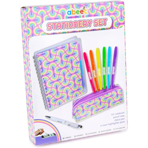Abeec Set di Cancelleria per Ragazze | Materiale Scolastico con Quaderno A5, Penna a Sfera con Stilo, Astuccio e 6 Evidenziatori Neon | Set di Cancelleria Unico