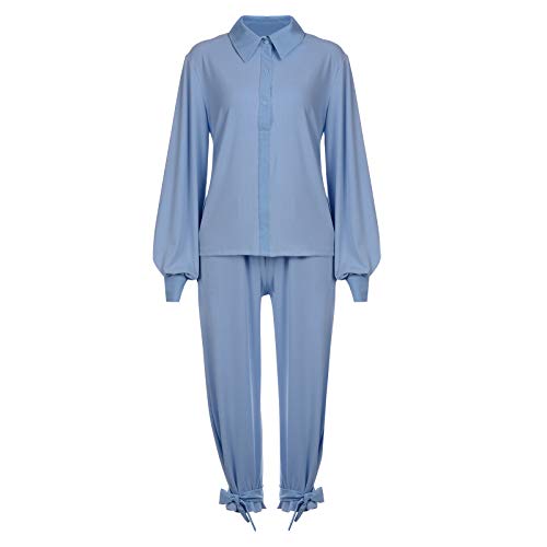 Abiti 2 Pezzi Donna Autunnali Camicia Maniche Lunghe con Risvolto a Coste Tinta Unita Completo Pantaloni Lunghi Nero Verde Bianco Blu Poliestere Suit (Blu, Small)