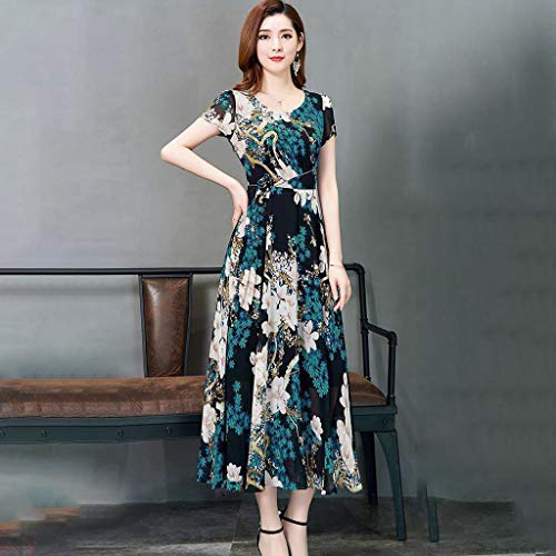 Abito Moda Casual Donna O-Collo Manica Corta Abito Lungo Stampato Slim A-Line (XL,1blu)