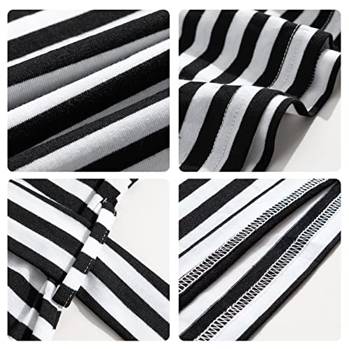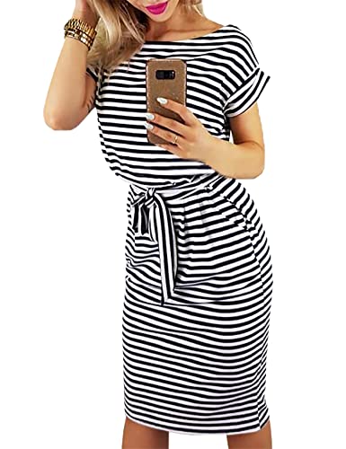 Abito Corto Maniche da Donna, Vestito Scollo Tondo a Maniche Corte, Sottile Elegante Abiti Estivi, Miniabito Fascia Elastico, Strisce Abito al Ginocchio con Tasche e Cintura,strisce bianche e nere S