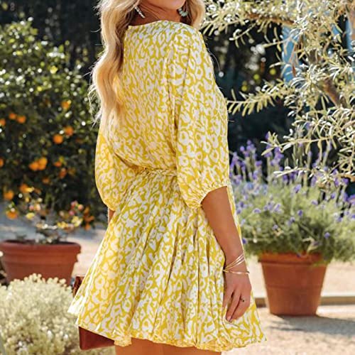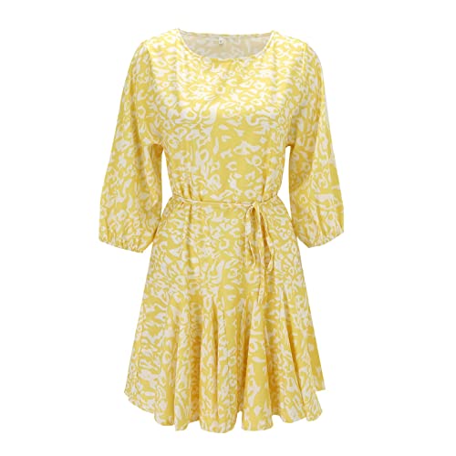 Mini abito da donna a maniche lunghe con stampa floreale a maniche lunghe, girocollo, con nodo in vita, maniche lunghe, stampa floreale, per matrimoni, ospiti, Giallo, S