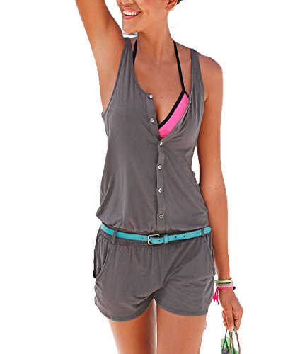 Abito Donna Scollo A V Senza Maniche Estate Fuori Spalla Tute Pagliaccetti Pantaloni Corti Tuta Vestito da Mare Spiaggia Backless Playsuit Grigio S