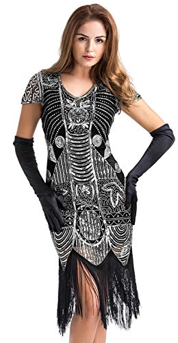 Cothin elegante abito flapper anni '20 è decorato a mano con paillettes scintillanti e perline di vetro, lo speciale orlo frastagliato oscilla con morbida frangia nera e una cerniera posteriore nascosta conferisce alla tua forma elegante.
