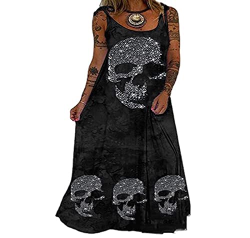 Abito da Donna con Teschio Largo Nero Abito da Donna con Spalline Punk Senza Maniche Plus Size Cami T Shirt Abiti Lunghi
