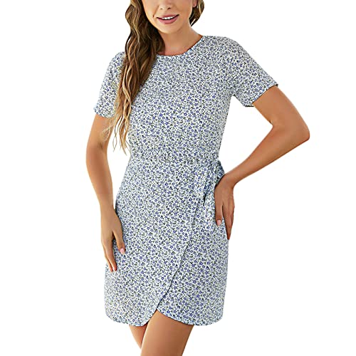 Abito estivo da donna, comodo, con stampa floreale, scollo a V, maniche corte, elastico in vita, casual, per donne e ragazze, Blu, L