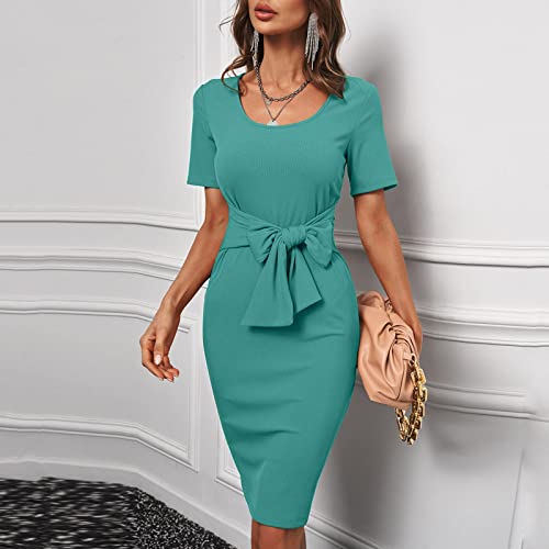 Abito estivo da donna, elegante, con fiocco, tinta unita, scollo rotondo, a maniche corte, mini abito da donna, per le vacanze, per la spiaggia, verde, M