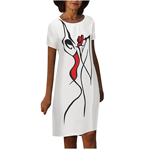 Abito estivo da donna, abito estivo da donna, elegante, in lino, a maniche corte, casual, linea ad A, con scollo a V, per il tempo libero, con stampa floreale, A16 bianco, xxl