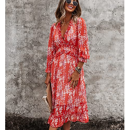 Abito Estivo da Donna a Maniche Lunghe con Scollo a V Profondo con Stampa Floreale Altalena Fluida Abito Casual con Maniche a Sbuffo con Orlo Elastico in Vita(S 35x22.5cm 25cm(Wooden Stick)-Rosso)