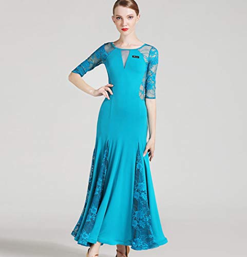ZYLL Abito in Pizzo Abito da Ballo Moderno per Le Donne Standard Nazionale Ballroom Outfit Lace Stitching Tango Waltz Gonna da Ginnastica Tulle Swing,Blue,M